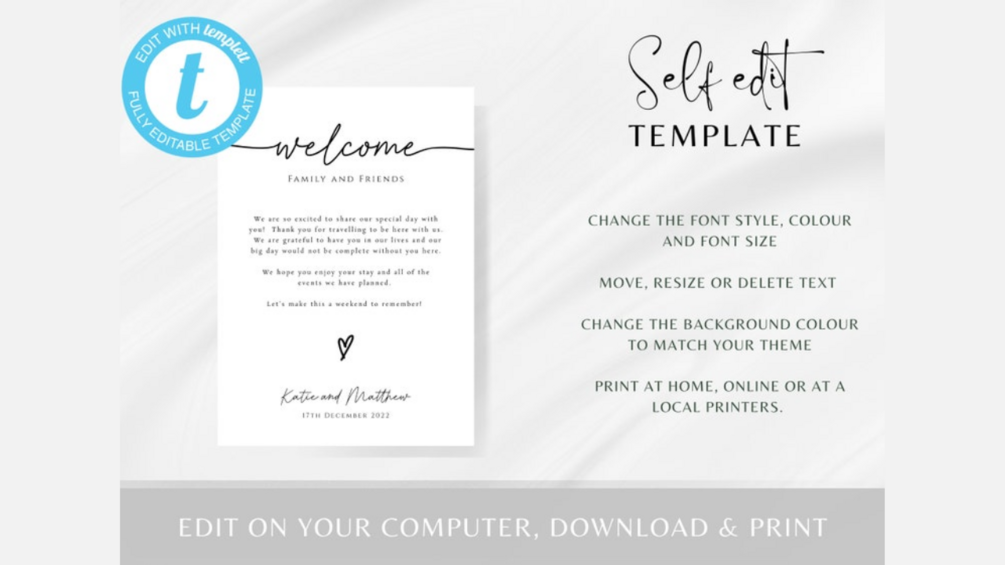When planning at wedding there are so many things to think about! Save yourself time and money by printing these wedding event/welcome cards at home. No waiting around for the post to arrive, you can print these off at a time that suits you.